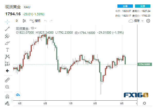 FX168财经报社(北美)讯 周二(9月7日),金价下跌逾1%,并创下近一个月来最大盘中跌幅,因美元上涨和收益率上升令黄金失去吸引力。 美市尾盘,现货黄金收报1794.16美元/盎司,大跌29.01美元或1.59%,创下自8月9日以来最糟糕的一天,日内最低触及1792.23美元/盎司,较日高1827.24美元/盎司大幅回落35美元。