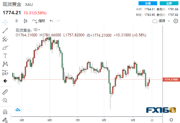 FX168财经报社(北美)讯 周二(9月21日),金价上涨,因对中国恒大破产的担忧引发避险买盘,美联储开启为期两天的会议,可能为央行削减对美国经济刺激措施的时间表提供线索。 美市尾盘,现货黄金收报1774.21美元/盎司,上涨10.31美元或0.58%,盘中最高触及1781.66美元/盎司,较日低1757.82美元/盎司回升近24美元。